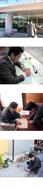 - 土地要約書、建物要約書、公図、地積測量図等の閲覧を行い所有者・所在地番・隣接地番・敷地の形状・地目の確認・古い建物の登記簿の有無の調査をします。お客様の住民票も取得します。